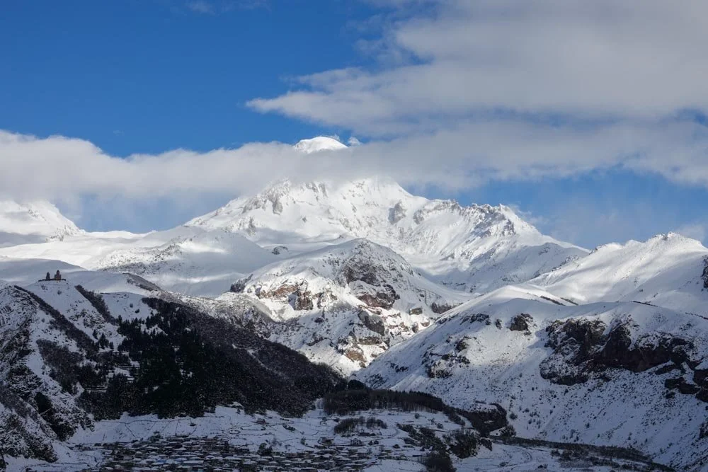 Moving on to Georgia, we were told that every place in Georgia was spring green at the start of this week. But we woke up in our hotel room in Kazbegi, looked out our hotel room window, and this was our view. On a side note, if you look at the center left in the photo below, we drove up to the church on the hilltop later this day.