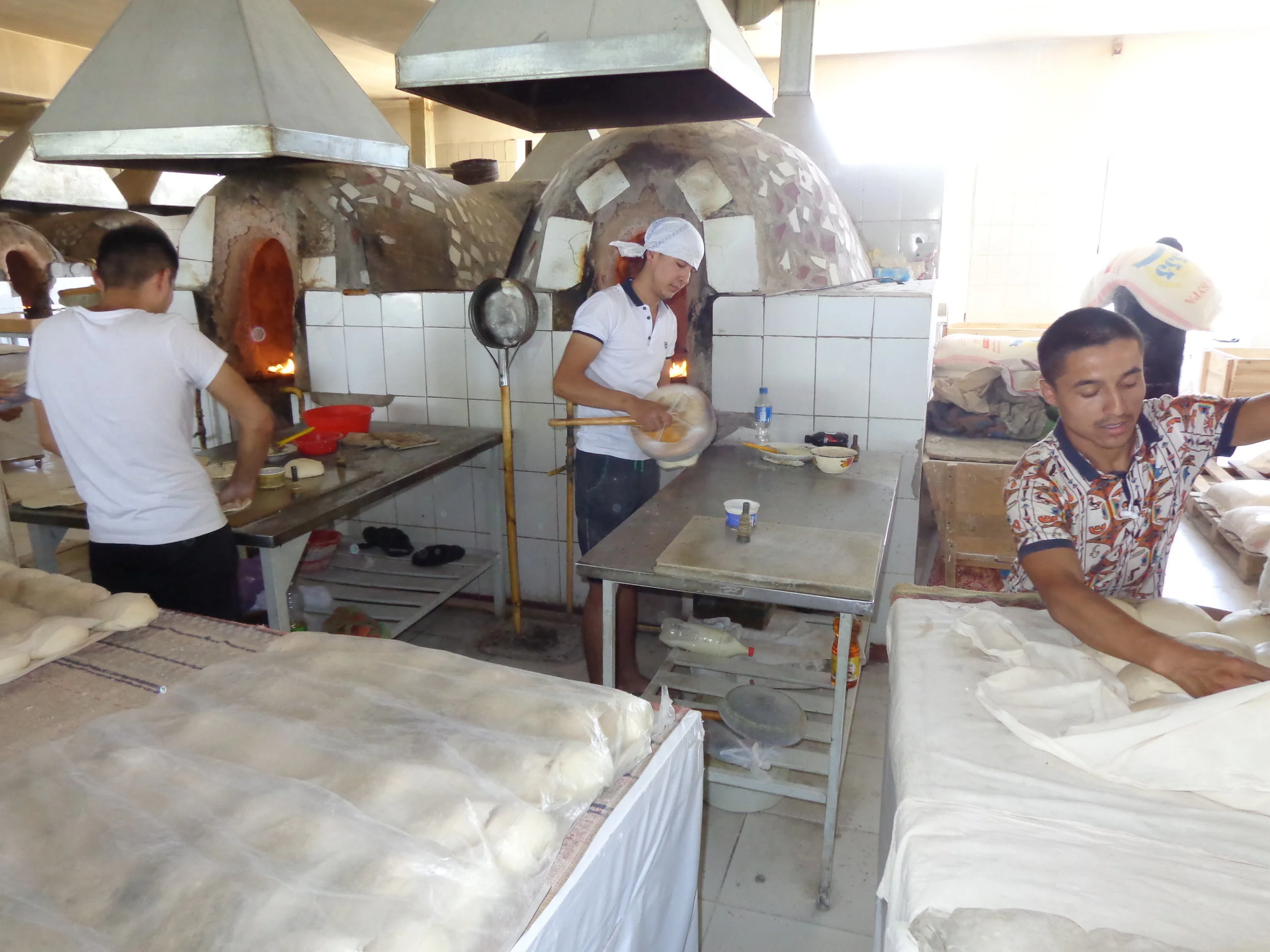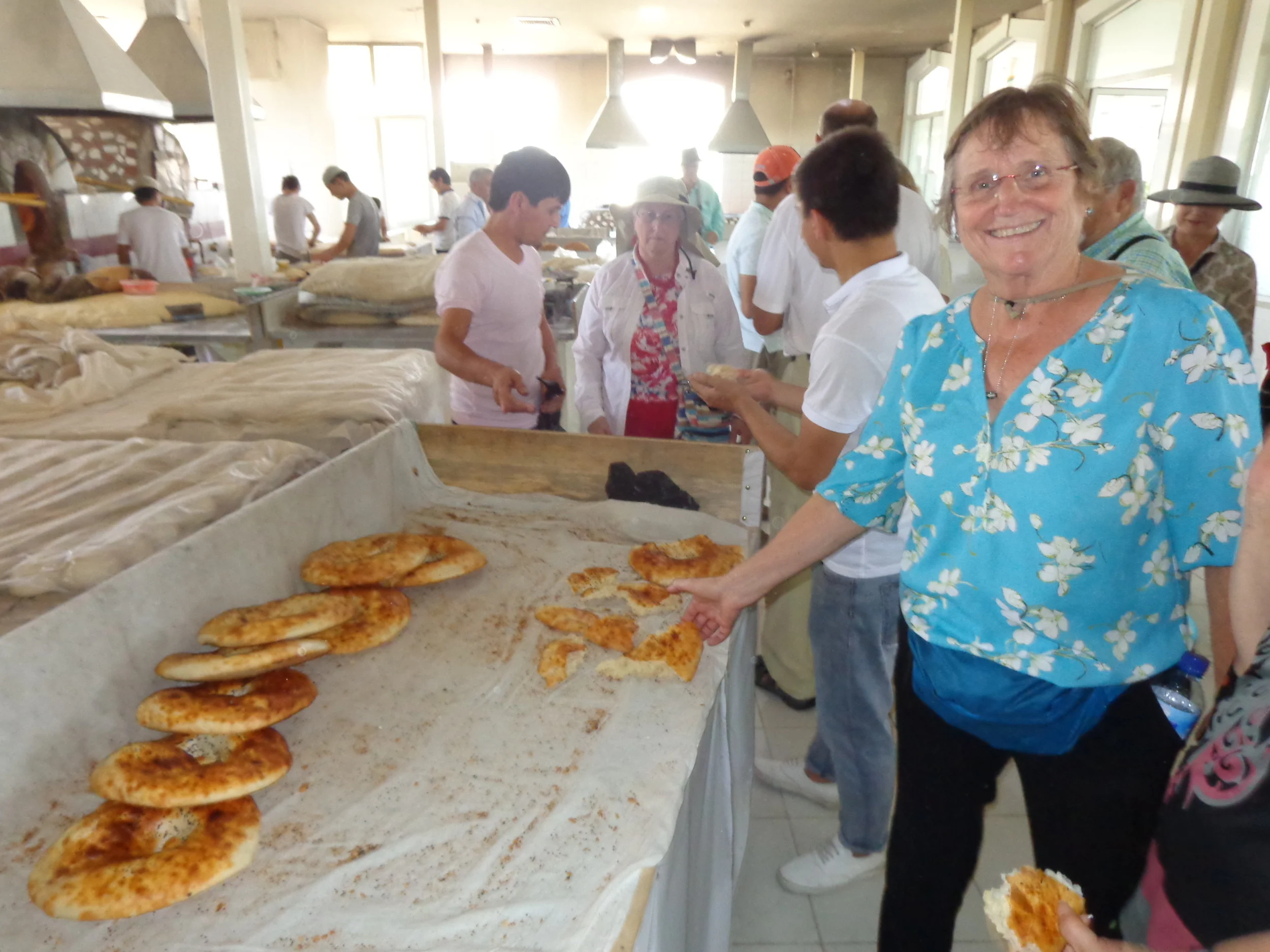I gave considerable thought to this posting. I could fill a dozen posts on the Chorsu Bazaar but am not going to do that. So I just picked out my favorite stop of the entire bazaar and will devote the last three photos to that stop. My favorite stop was the bread vendors. The bread people were as busy as a beehive. I don’t know how many bread ovens were working but they were really cranking out the bread. It was like an assembly line operation. You can see a photo of one small part of the bread making operation in the third photo. The fourth photo is the back end of the operation. It looked like most people took home some bread. In the bread making area, they had a sampler table which you can see in the last photo. They would tear up a bunch of loaves and people could sample all they wanted. You can see Vicky reaching for a piece of bread. I sampled a bit for everyone. The bread was delicious.