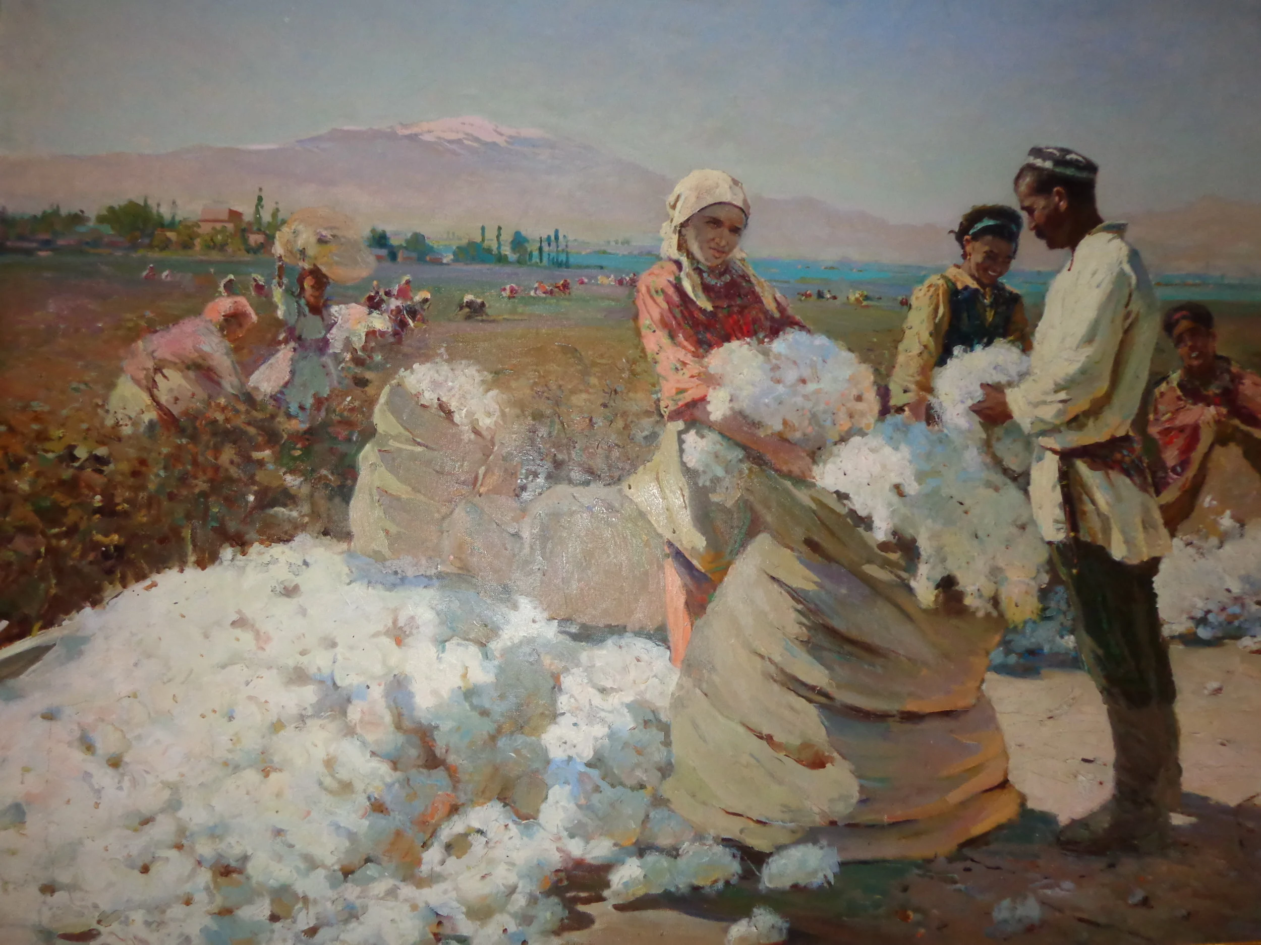 This painting in the cotton room in the third photo is a good example of what we saw. Central Asia was the soviet cotton producer. The people in the painting sure do look happy about their work.