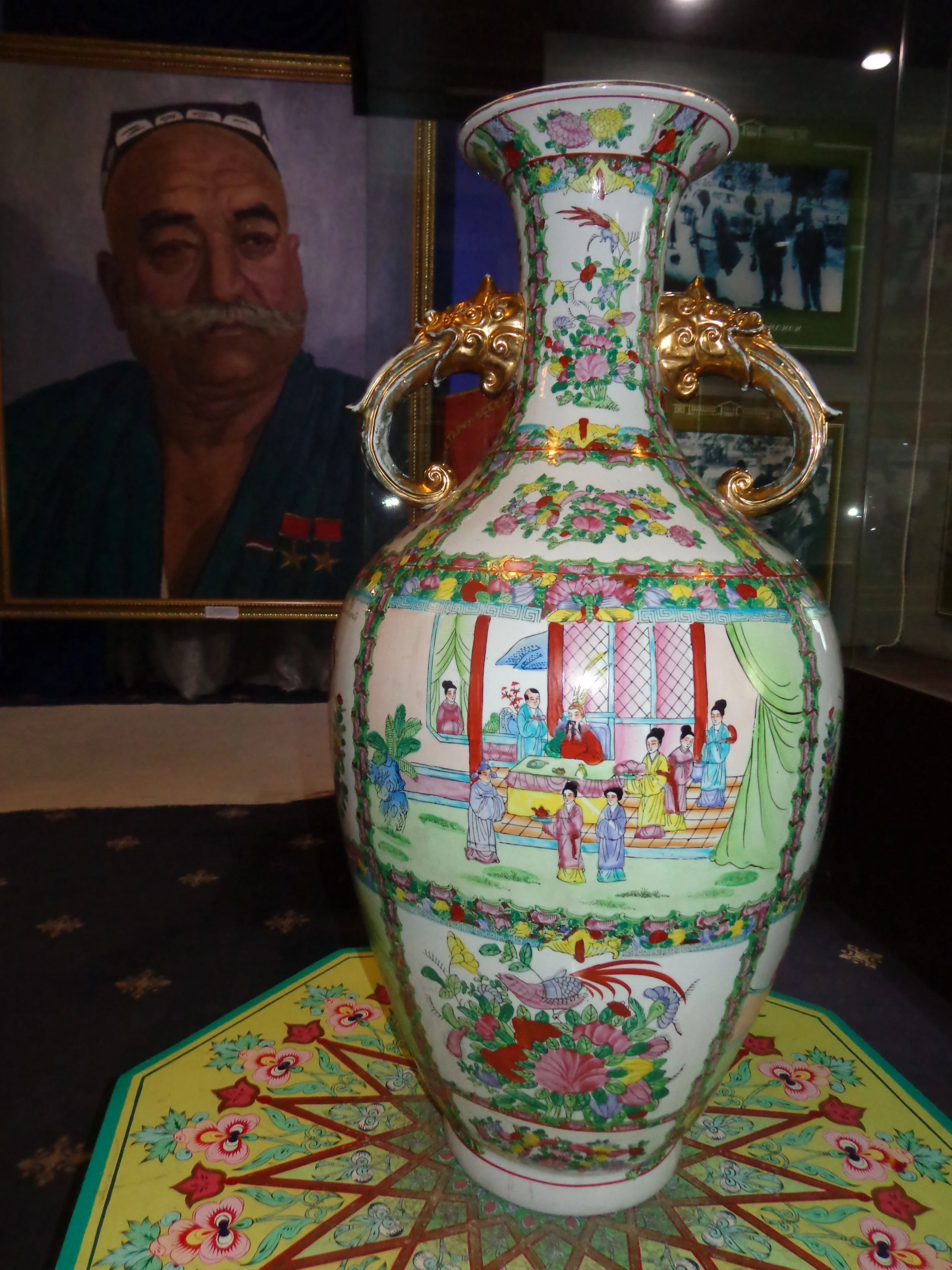 The last photo is also in his office. This is his actual desk. Behind the desk is the palace as originally constructed. On his desk is a blotter with an outline of the Kremlin. And if you wonder how on earth a soviet satellite collective farm leader could manage to get the funding and build a palace like this, look at his desk again. He has two phones, a black one and a red one. His red one was a direct line to the Kremlin leadership. Urukhojaev had the Tajik pride and courage to defy the soviet dress code. I expect that he was a larger-than-life character. I also expect that his collective farm was incredibly productive and stood out amongst the soviet’s collective farms.