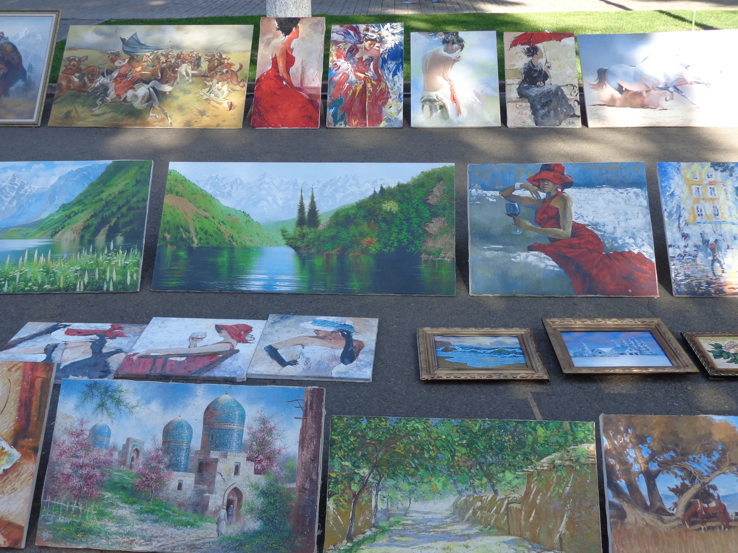 The third photo is a large park area. The water feature in the first photo was at one end of this park area. If you look closely, you can see that streets run through this park. The next street up has cars parked on it. One of the cross streets was closed and there was an art show or fair going when we were there. I am just including one photo from the art fair which you can see in the fourth photo. This photo was one where there were quite a few paintings grouped together. Themes include horses, water, mosques, and even beautiful women. The crowd at the street art fair was very “artsy”.