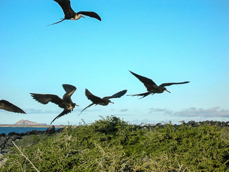 Here is one of the real star performers of the Galapagos Islands. I loved the frigatebirds. They were very active, very big, and provided lots of action. Some people didn’t like them because they can’t secrete enough oil to make their wings waterproof and so they can’t dive for their own fish. They therefore harass other birds who have caught fish to cough up the fish and they usually catch the regurgitated fish in mid-air. Frigatebirds have the largest wingspan-to-weight ratio of any bird. Their wingspan can be up to 7.5 feet.