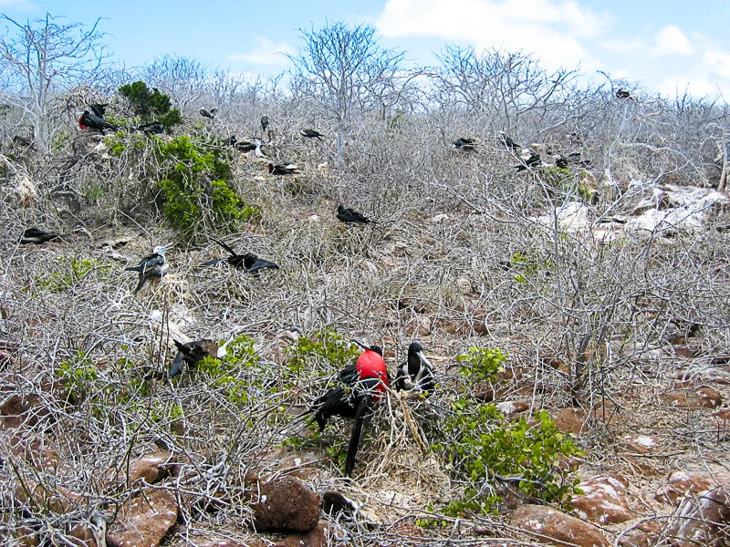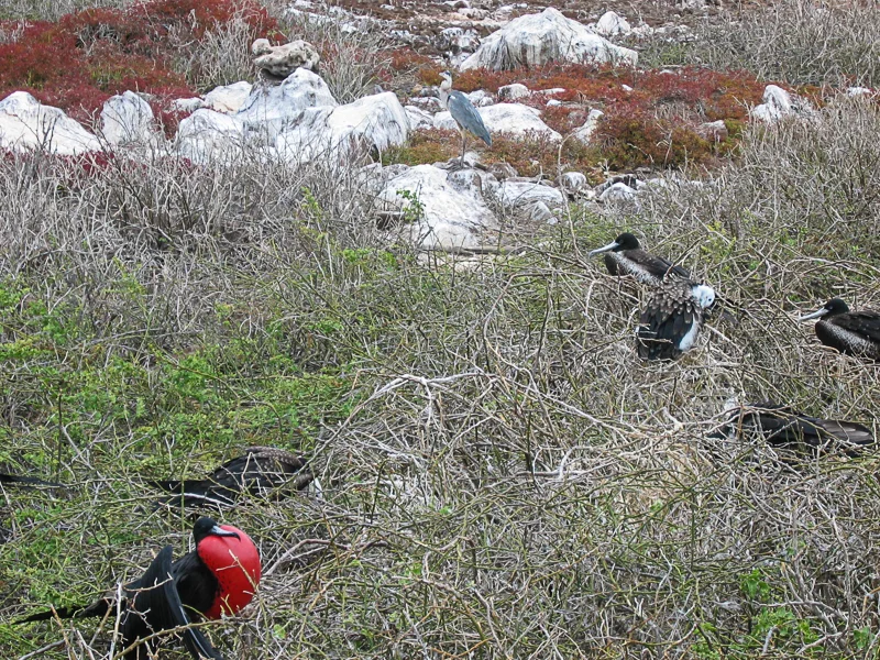 In the last photo, you can also see a great blue heron. There are two kinds of frigatebirds: the Magnificent Frigatebird and the Great Frigatebird. This colony had both kinds.