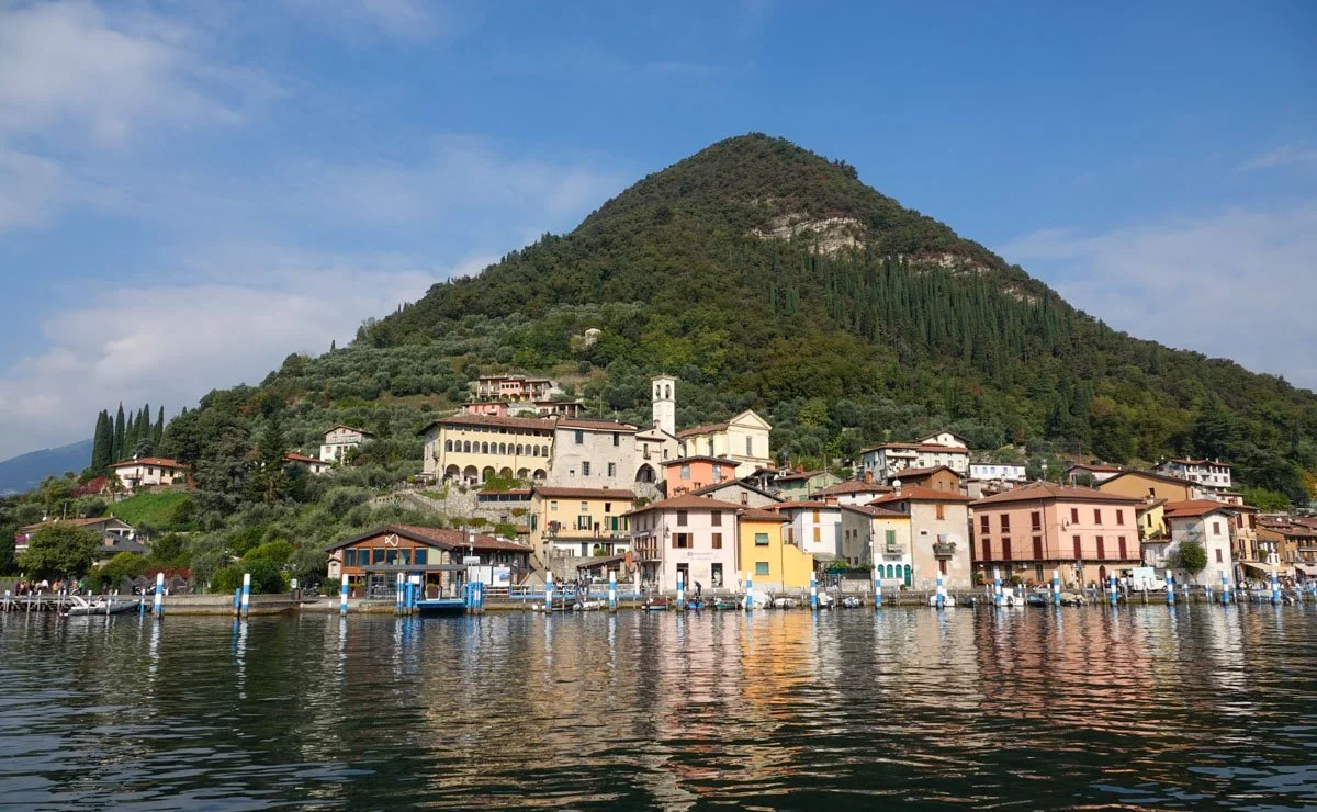 The largest island in the lake is Monte Isola. It rises steeply from the lake and is the largest inhabited lake island in Europe. It is made up of small fishing villages and has chestnut woods and olive groves on its slopes. It is connected to the mainland and various other towns by ferries.