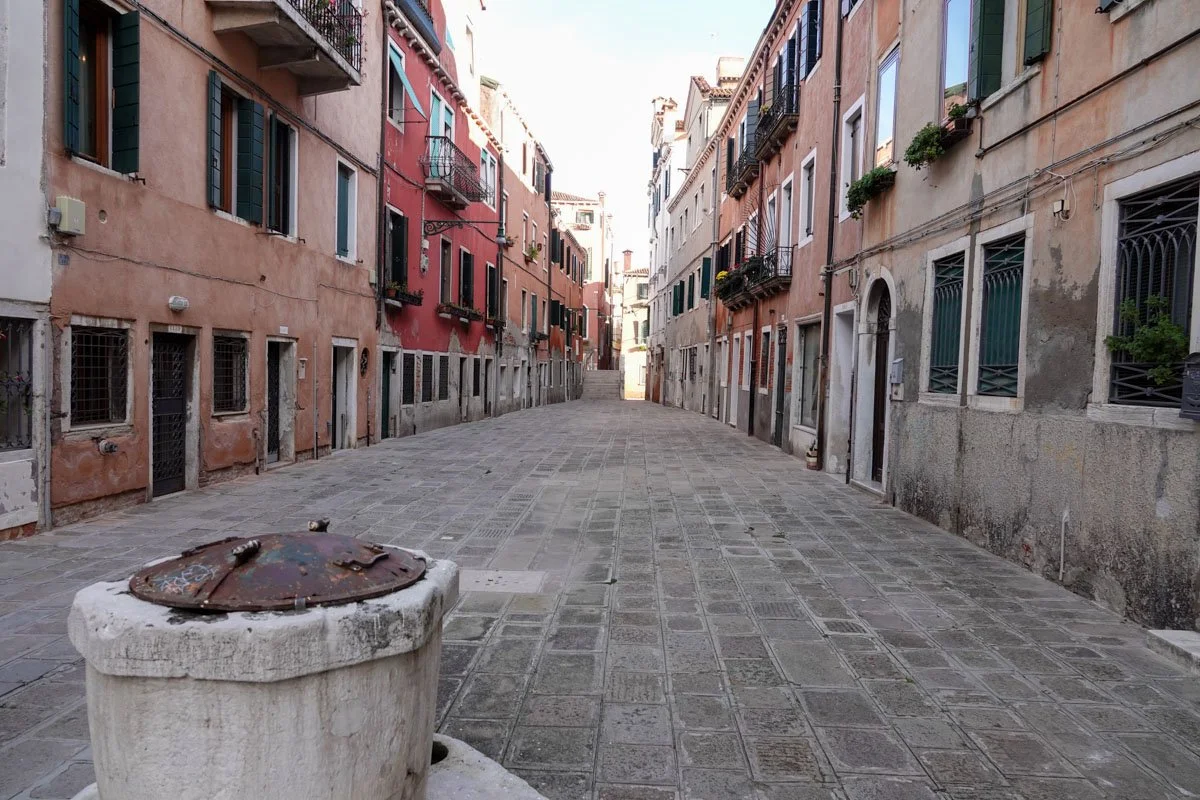 It might seem that Venice is a super busy city. It is, but Vicky and I managed to follow our noses down streets and alleys, while getting lost, just for the heck of it. We just wanted to get off the beaten path and see what else we could find. Some streets were empty entirely. You will also notice a cistern in the photo. Venetians used to get all their water from these cisterns. The cistern water has long been polluted, and water has long since come to Venice from an aqueduct from mainland wells. All cisterns have long since been sealed off to prevent anyone from drinking the water.