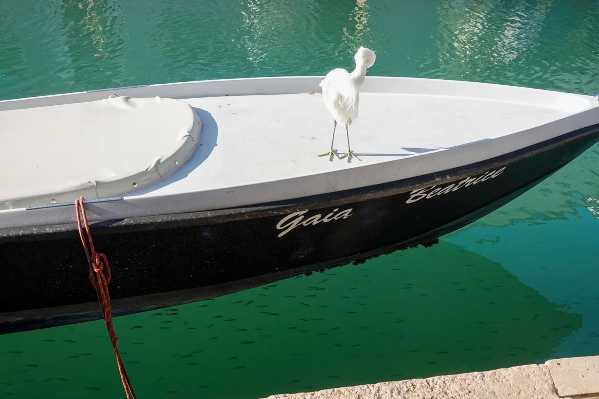 I was walking along the street when I saw this snowy egret standing on a boat right next to me. I asked the bird what he was doing standing there. Vicky answered for the bird by saying to look in the water. Question answered.