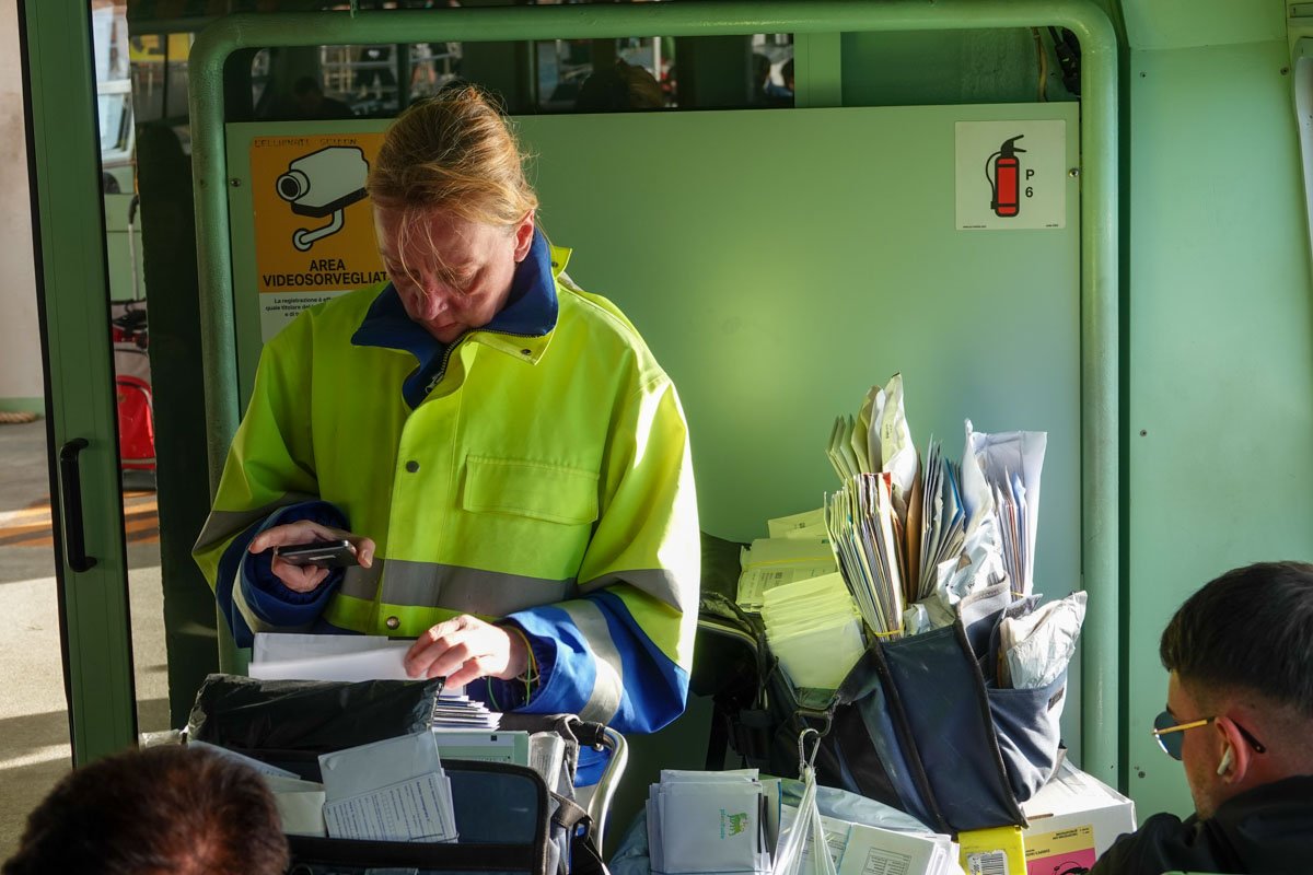 The first was on a water bus on our way to Burano. A mail carrier sat across from us on the water bus, sorting out her mail. She got off the bus with us on Burano Island.