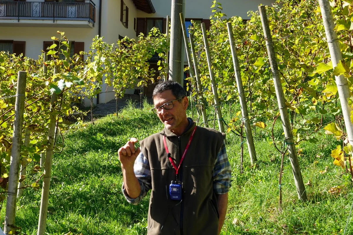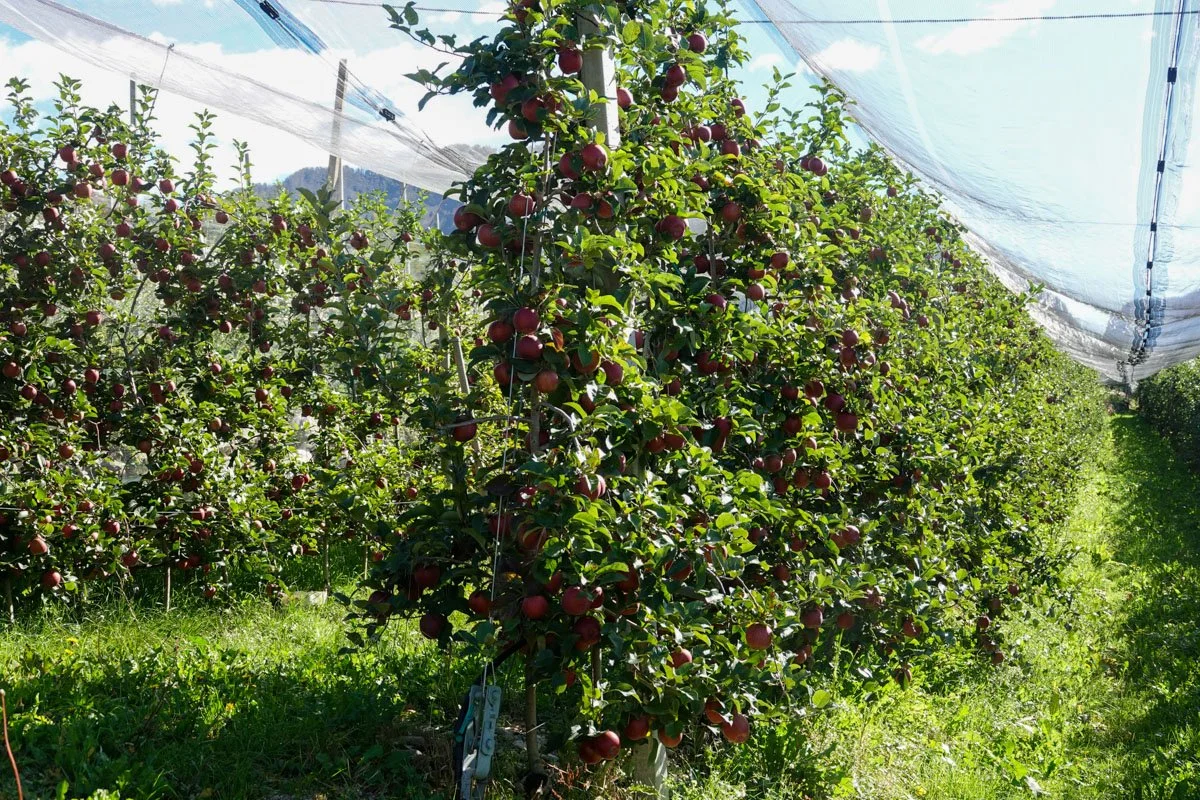 I personally guessed birds: WRONG. Elvio told us it was due to "hail". He said that climate change has caused Switzerland and Northern Italy to have much more frequent and more intense hailstorms. Since over 90 percent of their apples are for the fresh apple market, they can't afford the damage that hail would do to their apples. At least three people on this trip told us that and all blamed climate change.