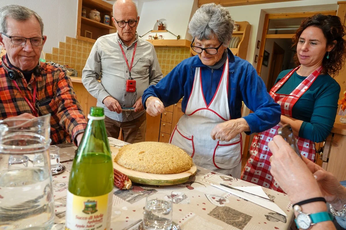 We were served lunch with probably everything being home grown and homemade. Elvio's mom and his wife made us lunch. They made polenta which his mom cut with a thread, then covered with tomato sauce and Trento cheese. We had homegrown squash, cabbage with fennel, fresh made bread, and homemade apple juice and wine. Dessert was a crumble cake and fresh apple slices, done by his daughter. Lunch was excellent!