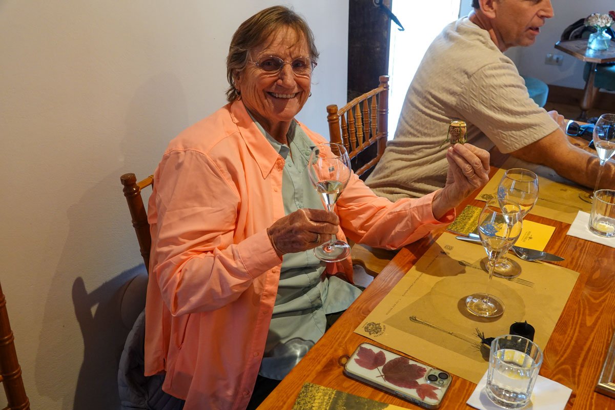 After our winery tour, we were seated in a tasting room and "blind tasted" (with a complete blindfold) three wines: a fresh, young, sparkling wine; a less pressure, long-aftertaste wine, and a sweet-aged wine. Vicky was one of only two people in our group of 16 that correctly guessed all three wines in the blind tasting. Her prize for guessing correctly was a wine-cork, which she is holding in her hand.
