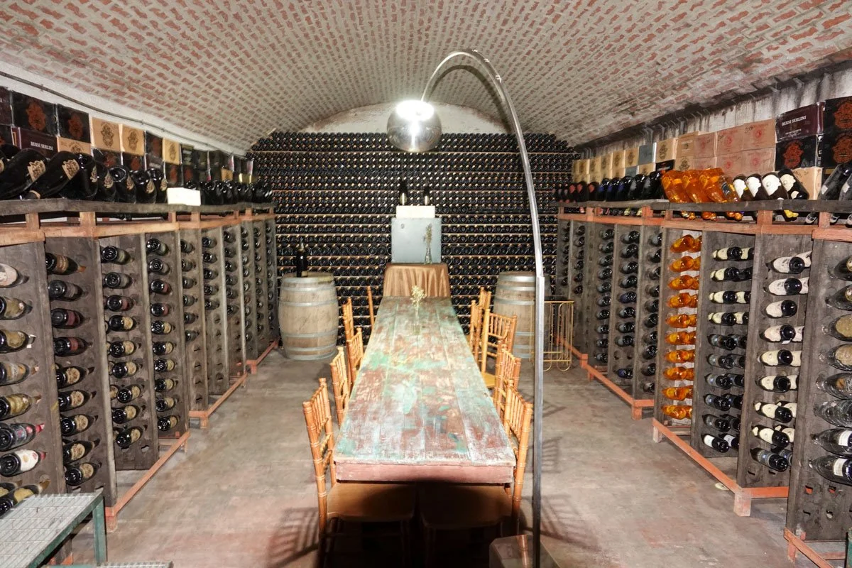 They have two underground cellars, the vinification cellar and the maturation cellar. Both cellars are substantially underground. We first walked the grounds, perused the crushers and so on and then went down into the vinification cellar. Our guide said that they harvest in August to get the grapes at high acidity which helps for sparkling wines. Since we were here in mid-October, most of the initial work had long since finished.