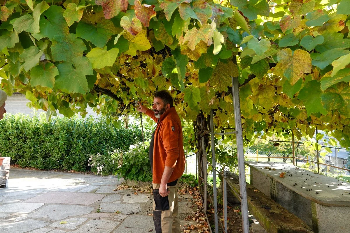 He showed us his cheese and butter making equipment, process, storage, etc. Like most farmers, he also still has some grapes near his house as well as chickens, geese, fruit trees, etc. Here's he's showing and telling us about these grapes.