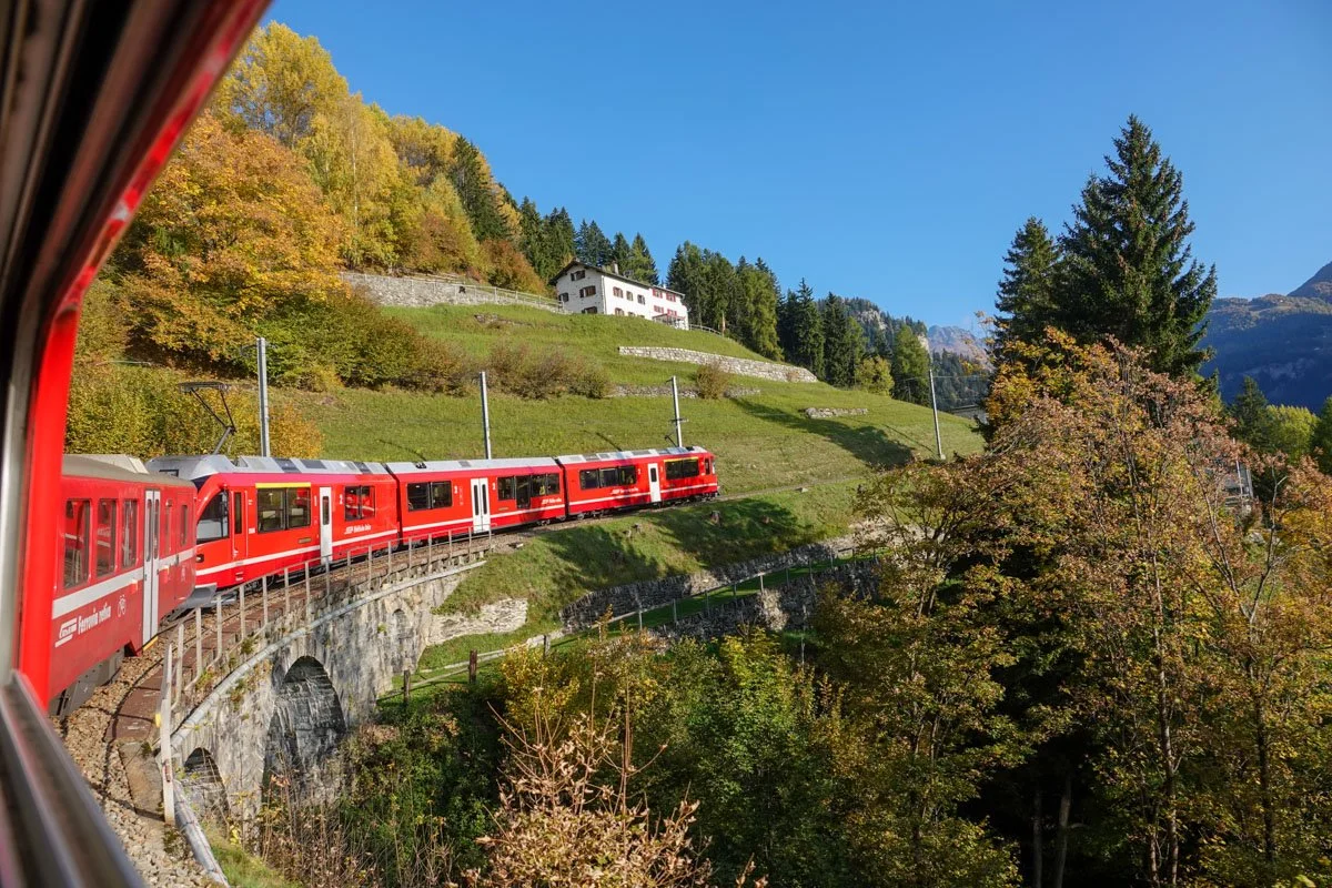 The Bernina Express is a UNESCO world heritage site, and I can see why. It is a 76-mile route that was built in three years, from 1907 to 1910. I don't know how they did it that fast. It has 55 tunnels that burrow through the mountains and some of them are quite long tunnels with substantial curves. It traverses 196 bridges and viaducts with some being highly elevated. The track gradient is up to 7 percent and it's the highest alpine train crossing at 7,400 feet elevation. It also crosses the Continental Divide.