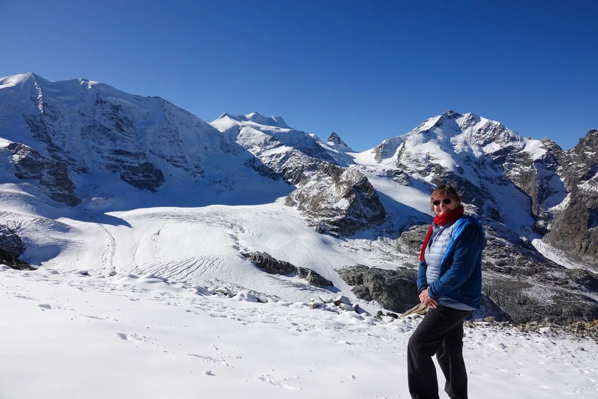 The elevation at Diavolezza is almost 10,000 feet high. We still managed to do some hiking around the area. As you can see, this is glacier country. The info signs at the station pointed out seven high peaks in sight plus many other smaller ones. It also pointed out several glaciers.