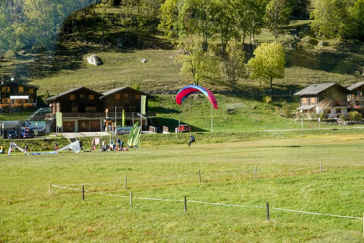 I've mentioned that the Swiss are great outdoor enthusiasts of all sorts. We passed paragliders on multiple occasions, and you can see one coming in for a landing below. The Alps seemed to be a perfect location for such sports.