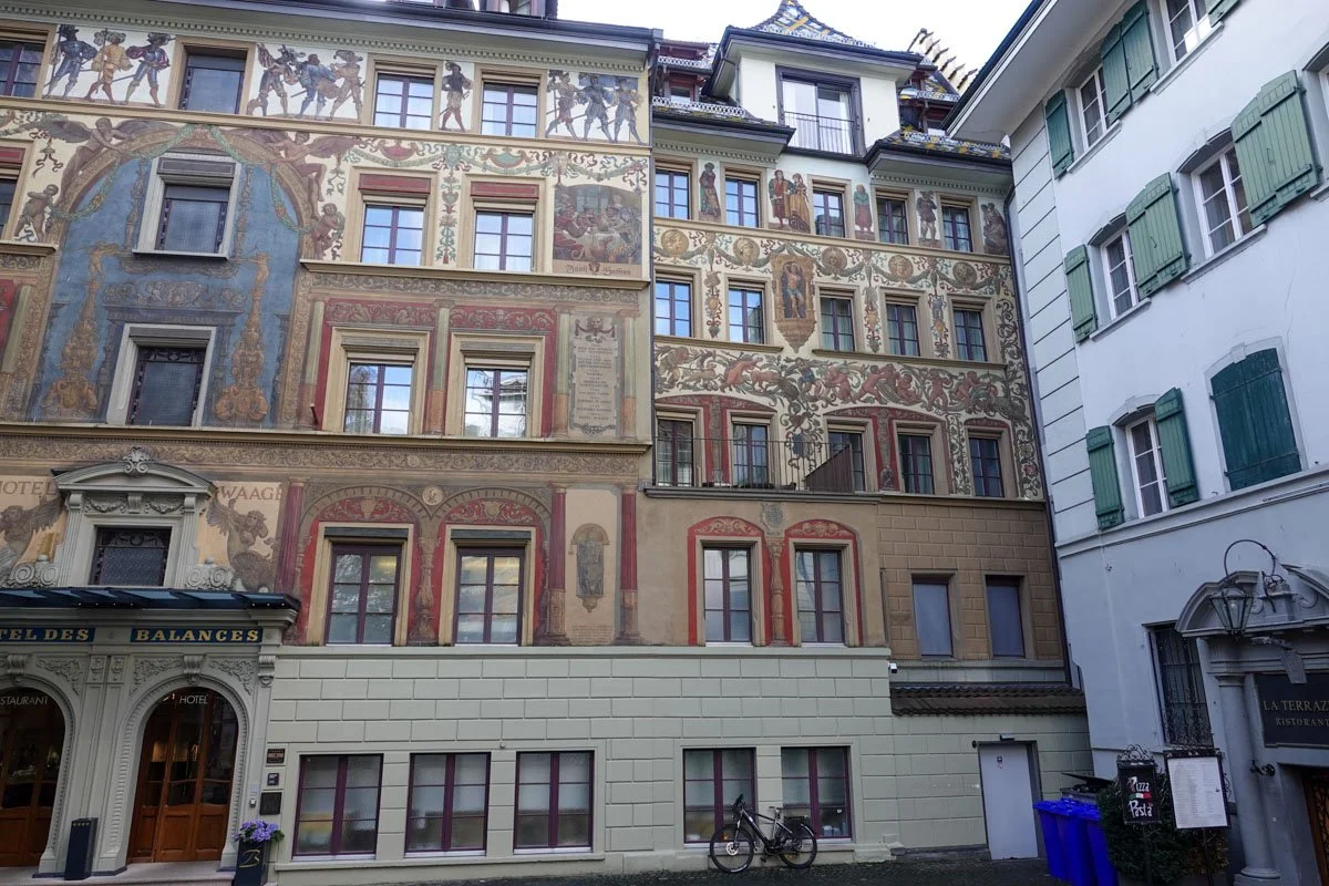 Lucerne's Old Town has some beautiful decorated buildings. The nicest ones have colorful frescos which depict some of the city's history and culture, such as their annual carnival, the legend of William Tell, historic battles, and the wedding of Canaan. The next two photos are some of the decorated buildings in Old Town.