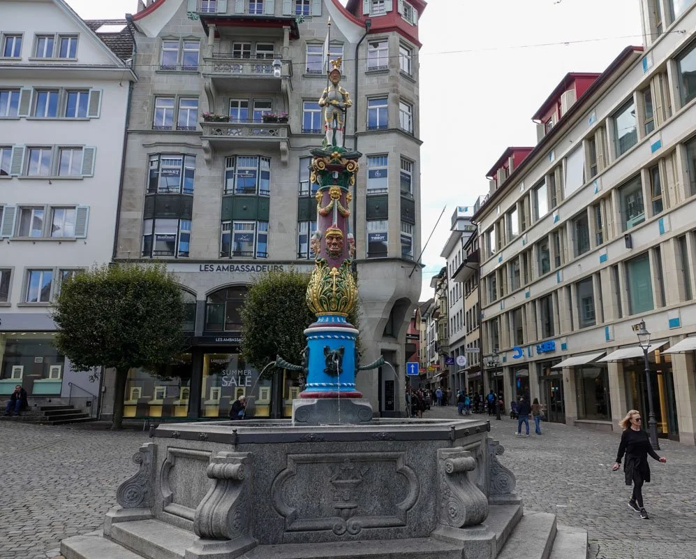 Lucerne did not have indoor plumbing until something like 1875. Long before that, the water they were drinking was very polluted and they had to address the problem. So back in the 1700's, they piped water down to town for drinking from high in the Alps. They have 200 water fountains in town which is where everyone got all of their water for centuries. All the fountains still work and people still use them to fill up their water bottles, including us. They are very proud of their constantly flowing mountain water, and the water fountains are large and highly decorative.