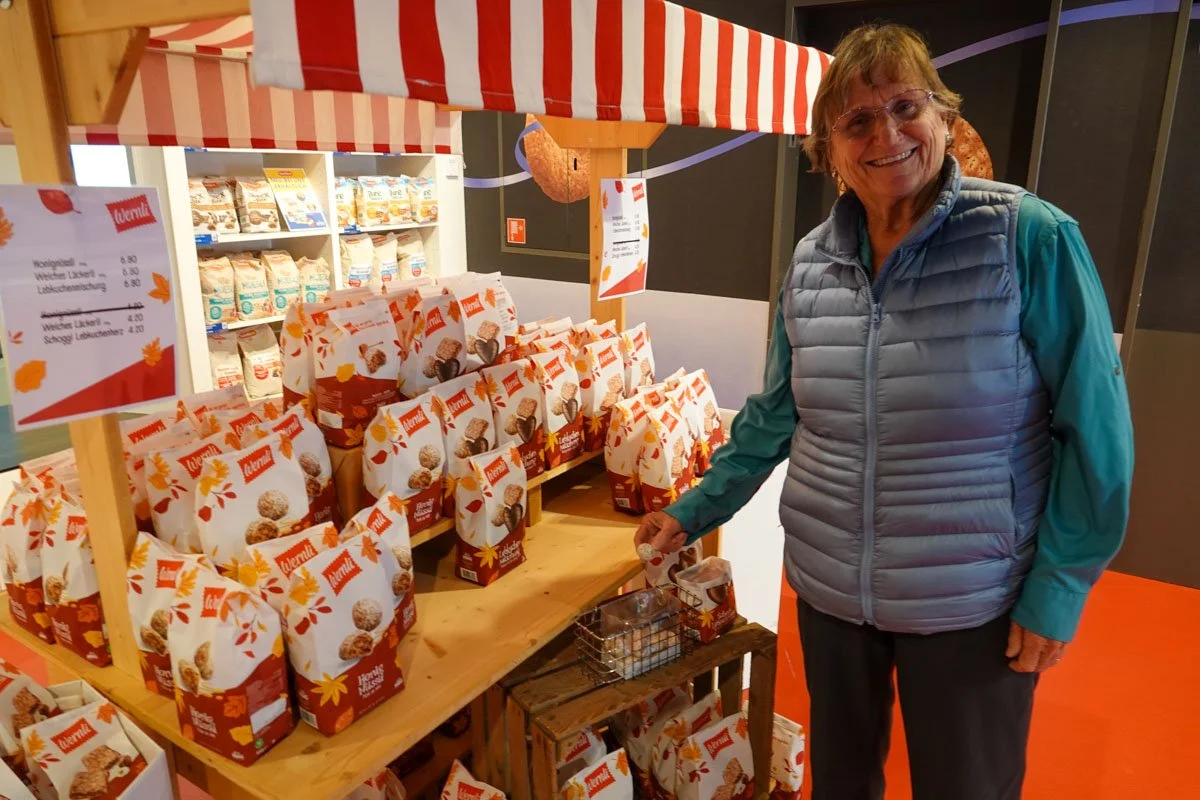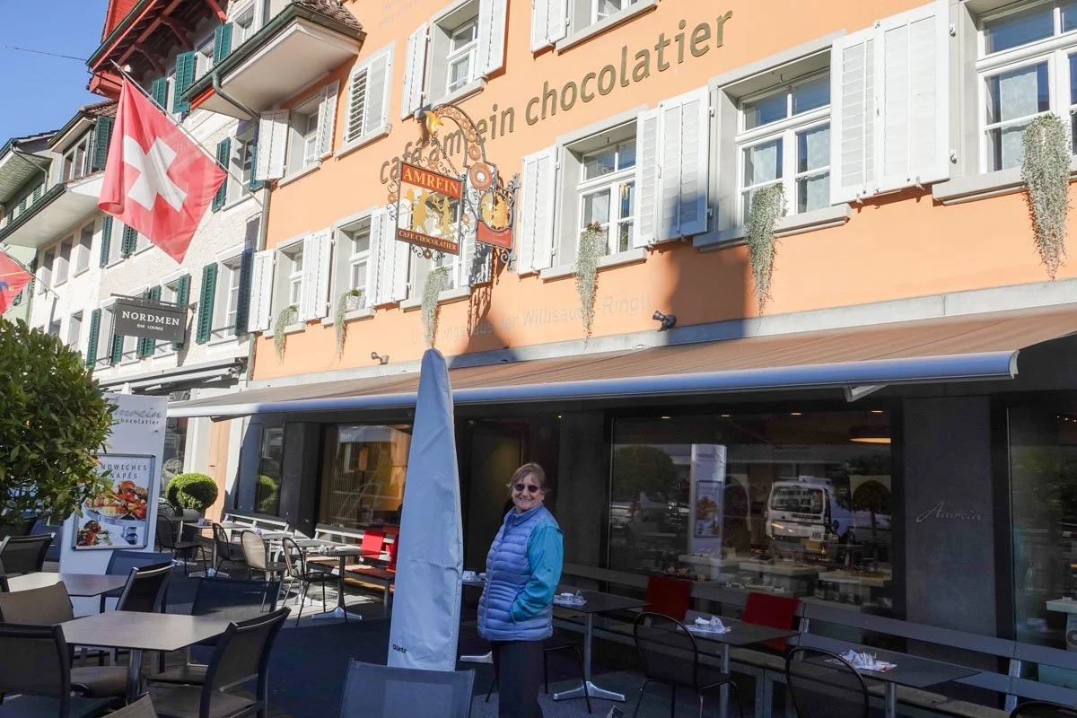 Willisau is famous as the home of the Willisauer Ringli, a traditional Swiss sweet cookie. They make dozens of different types of cookies. We visited the factory and store, saw their cookie making operation, and tasted handfuls of their cookies. As Vicky was listening to our guide, I was off taking photos. I came back to Vicky and she said, "Hold out your hand, palm up". I did that and she put a cookie in the palm of my hand. Then she told me to smash the cookie with my other elbow. I did that. I then looked down and saw the cookie broken into 4 pieces. Vicky said that because of that, I would be allowed to live in Willisau. She said that was a requirement of the town to live there. She did it but the cookie didn't break into 4 pieces, so she couldn't live in Willisau. I only got a photo of Vicky taking a cookie from one of the cookie tasting bins. It's an interesting tradition but I decided not to live in Willisau.